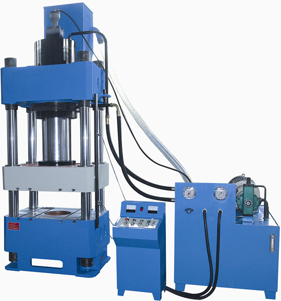 液壓機基本原理是油泵把液壓油輸送到集成插裝閥塊,通過各個單向閥和溢流閥把液壓油分配到油缸的上腔或者下腔,在高壓油的作用下,使油缸進行運動.液壓機是 利用液體來傳遞壓力的設(shè)備。液體在密閉的容器中傳遞壓力時是遵循帕斯卡定律。四柱液壓機的液壓傳動系統(tǒng)由動力機構(gòu)、控制機構(gòu)、執(zhí)行機構(gòu)、輔助機構(gòu)和工作介質(zhì)組成。動力機構(gòu)通常采用油泵作為動力機構(gòu),一般為積式油泵。為了滿足執(zhí)行機構(gòu)運動速度的要求, 選用一個油泵或多個油泵。低壓(油壓小于2.5MP)用齒輪泵;中壓(油壓小于6.3MP)用葉片泵;高壓(油壓小于32.0MP)用柱塞泵。各種可塑性 材料的壓力加工和成形,如不銹鋼板的擠壓、彎曲、拉深及金屬零件的冷壓成形,同時亦可用于粉末制品、砂輪、膠木、樹脂熱固性制品的壓制。