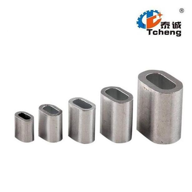 鋼絲繩鋁套—鋁套是鋁材質(zhì)的,較輕,用來固定鋼絲繩兩端的頭的,鋼絲繩根據(jù)需要的掛圈大小,插入鋁套,然后放入壓套機(jī)模具內(nèi),(根據(jù)鋁套型號對應(yīng)壓套機(jī)模具,模具型號跟鋁套型號都是標(biāo)準(zhǔn)尺寸),壓制完,把兩邊擠壓出來的鋁廢料清理掉,一根鋼絲繩完成!